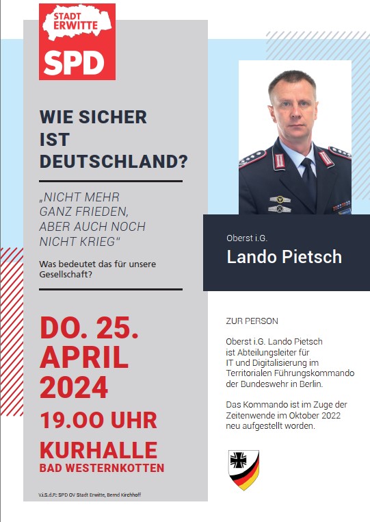 Auf Einladung der SPD Erwitte wird Oberst i.G. Pietsch zur Landesverteidigung in Deutschland...